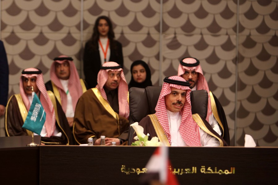 Saudi Arabian Foreign Minister Prince Faisal bin Farhan Al Saud (Front) attends a meeting in Amman, Jordan, on May 1, 2023. Foreign ministers of Jordan, Saudi Arabia, Iraq, Egypt and Syria met on Monday to discuss a political solution to Syria's humanitarian, security and political crises. (Xinhua/Mohammad Abu Ghosh)
