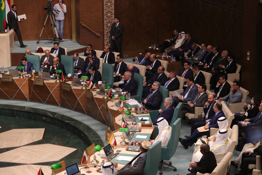 This photo taken on May 7, 2023 shows the scene of an Arab League (AL) extraordinary meeting held in Cairo, Egypt. Arab foreign ministers decided in an Arab League (AL) extraordinary meeting held in Cairo on Sunday to restore Syria's membership in the league after 12 years of suspension, said a final statement after the meeting. (Xinhua/Ahmed Gomaa)
