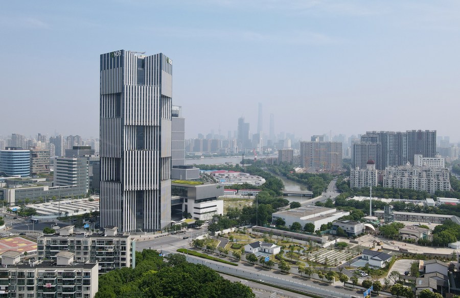 Aerial photo taken on June 17, 2022 shows the headquarters building of the New Development Bank (NDB), also known as the BRICS bank, in east China's Shanghai. (Xinhua/Fang Zhe)