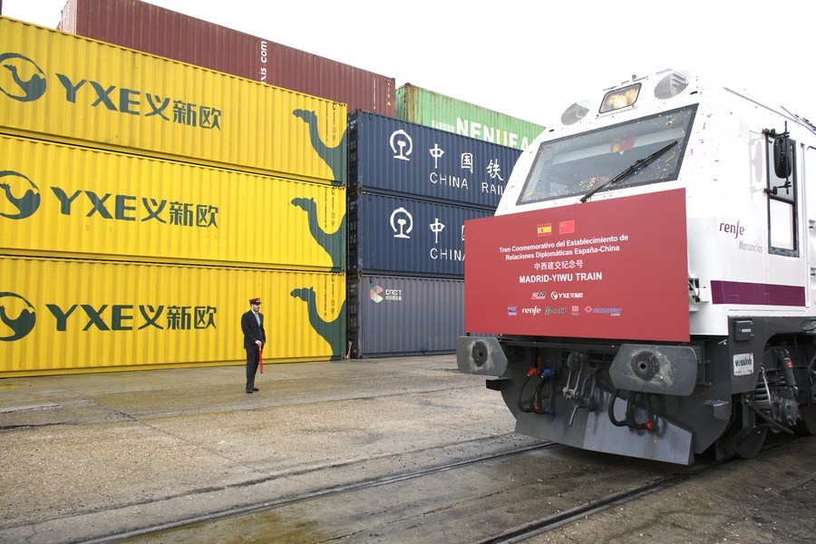 A freight train heading for Yiwu of China departs from Madrid, Spain, March 9, 2023. (Xinhua/Meng Dingbo)