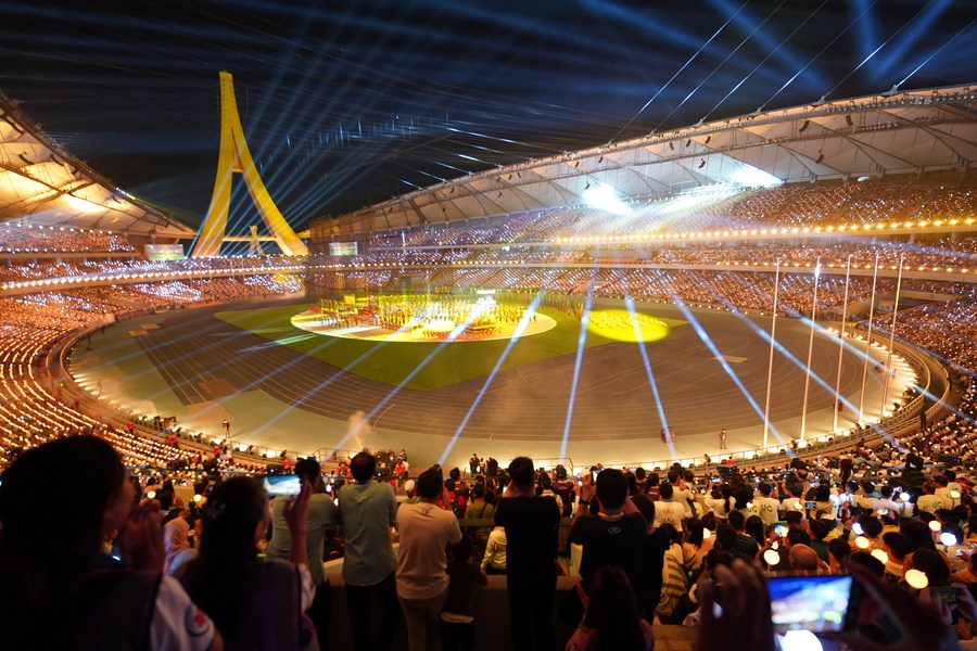 Photo taken on May 5, 2023 shows the opening ceremony of the 32nd Southeast Asian (SEA) Games at the Morodok Techo National Stadium in Phnom Penh, Cambodia. (Photo by Ly Lay/Xinhua)