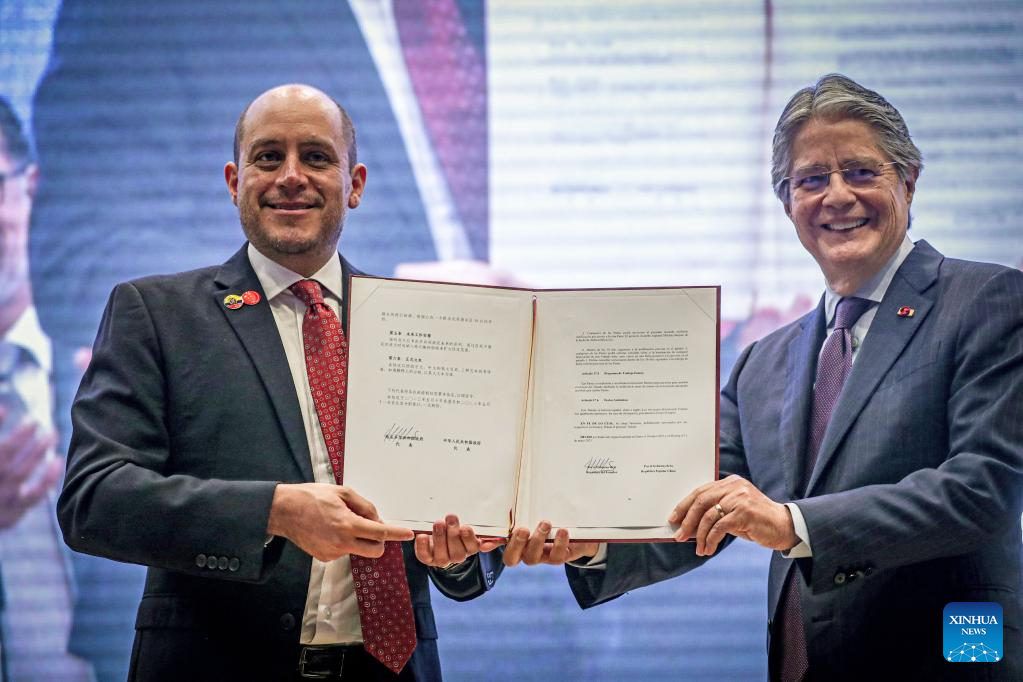 Ecuadorian President Guillermo Lasso(R) and Minister for Production, Foreign Trade, Investment and Fisheries Julio Prado display documents of a free trade agreement (FTA) between China and Ecuador in Quito, Ecuador, May 10, 2023. China and Ecuador signed a free trade agreement (FTA) Thursday to boost bilateral trade and business ties, according to the Ministry of Commerce. (Ecuadorian presidential palace/Handout via Xinhua)