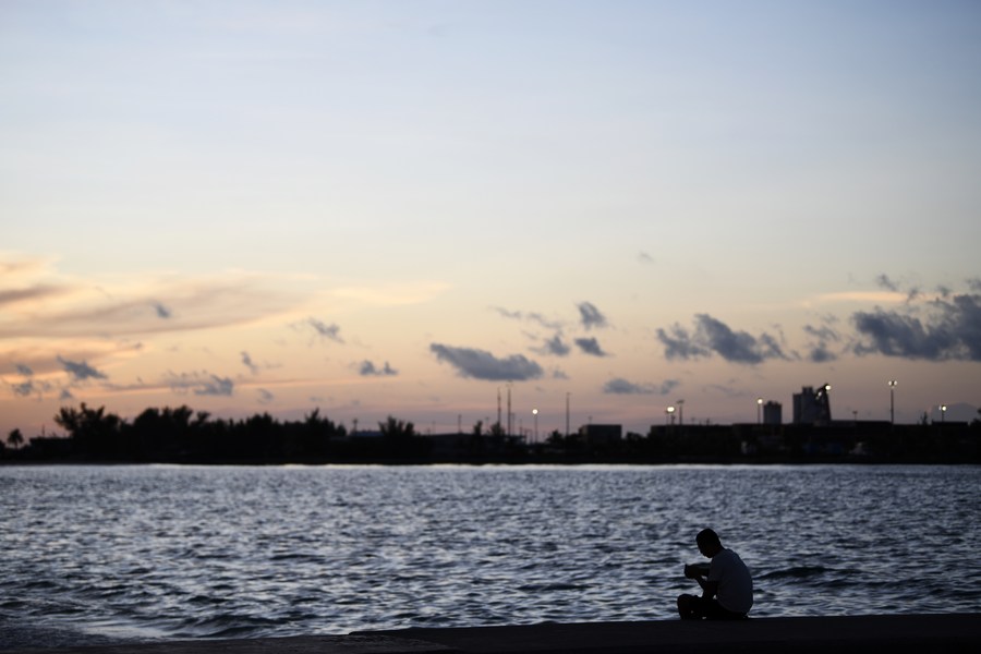 A man enjoys sunset on the beach days after Hurricane Dorian swept Nassau, capital of Bahamas, Sept. 16, 2019. (Xinhua/Xin Yuewei)