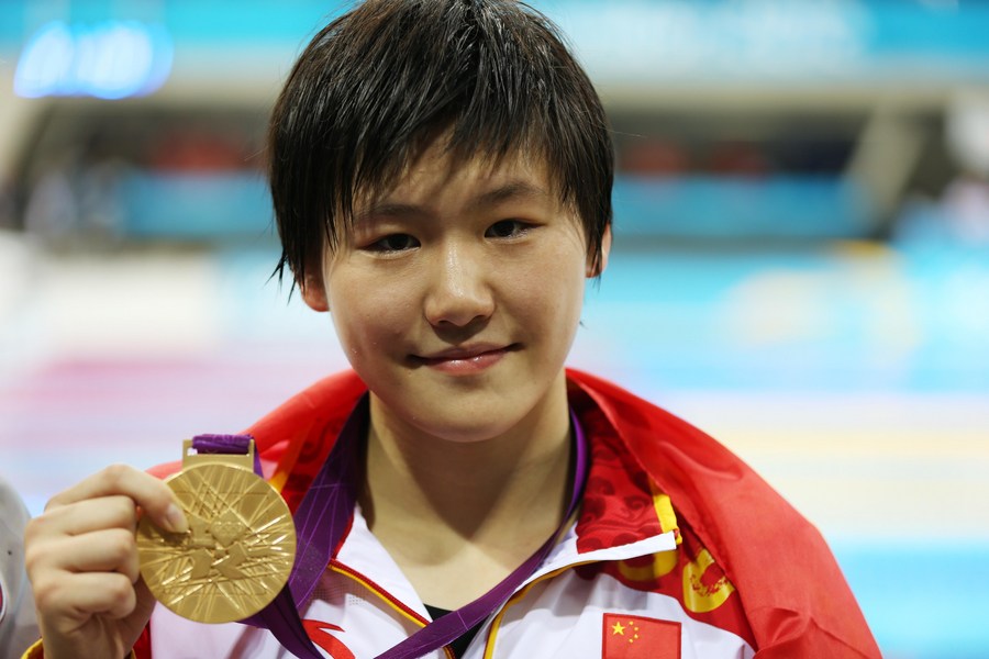 Gold medalist Ye Shiwen of China poses at the awarding ceremony of women's 200m individual medley at 2012 Olympic Games in London, Britain on July 31, 2012. (Xinhua/Fei Maohua)