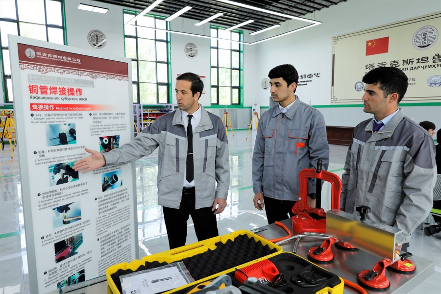 A Tajik professor introduces how to weld steel pipe to students at the Luban Workshop in Dushanbe, Tajikistan, April 12, 2023. (Photo by Kalizhan Ospanov/Xinhua)