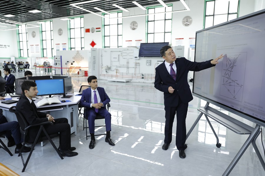 A Tajik professor introduces to students a green electrical energy device at the Luban Workshop in Dushanbe, Tajikistan, April 12, 2023. (Photo by Kalizhan Ospanov/Xinhua)