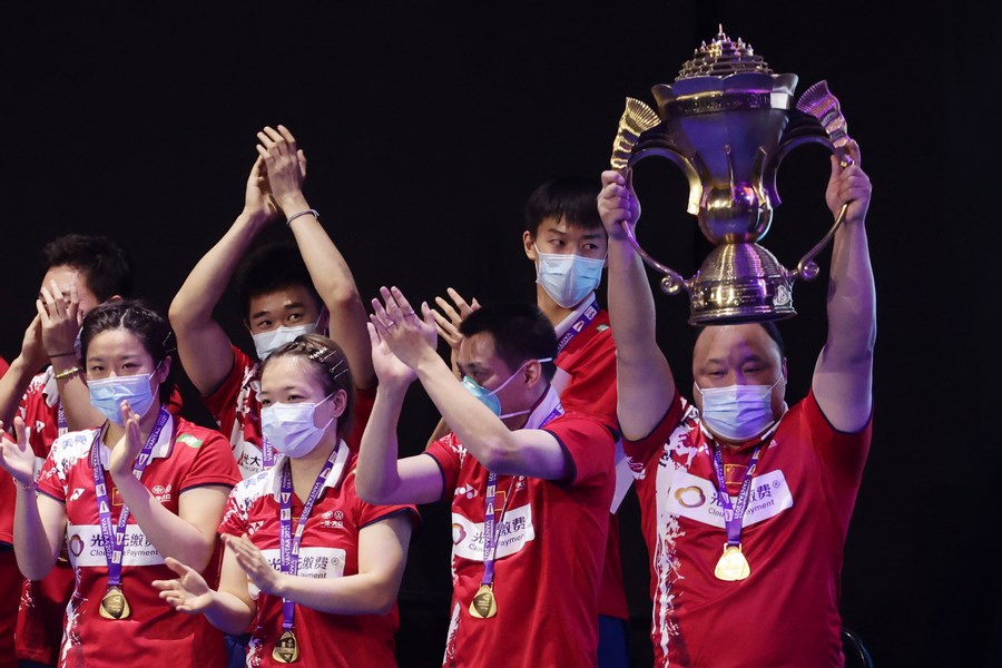 Members of team China pose for photos during the awarding ceremony at Badminton Sudirman Cup 2021 in Vantaa, Finland on Oct. 3, 2021. (Photo by Matti Matikainen/Xinhua)