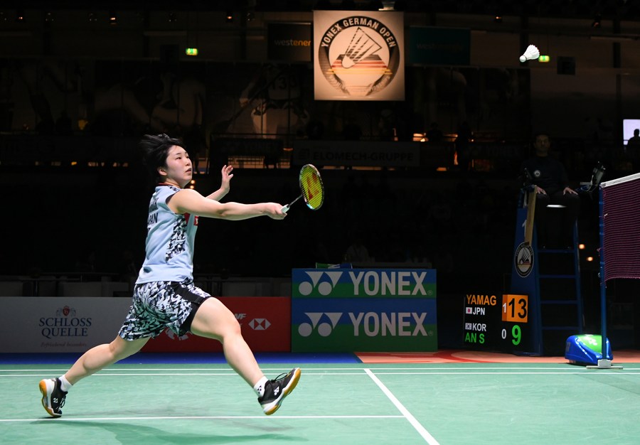 Akane Yamaguchi of Japan hits a return during the women's singles final against An Se-young of South Korea at the Yonex German Open 2023 badminton tournament in Muelheim, Germany on March 12, 2023. (Xinhua/Ren Pengfei)