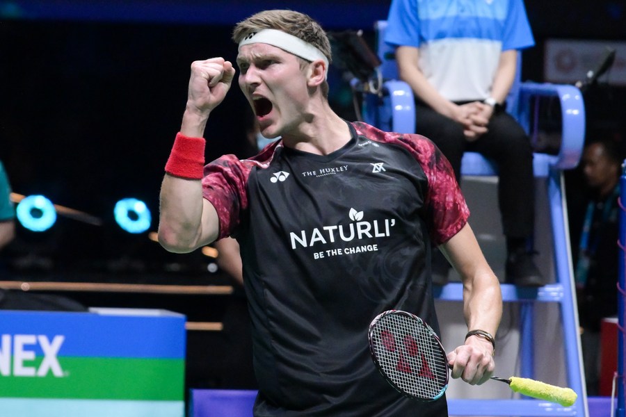 Viktor Axelsen of Denmark celebrates after the men's singles final against Kodai Naraoka of Japan at Malaysia Open 2023 in Kuala Lumpur on Jan. 15, 2023. (Xinhua/Zhu Wei)
