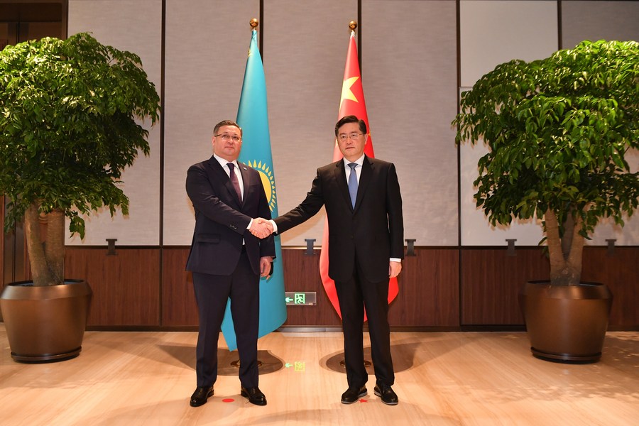 Chinese State Councilor and Foreign Minister Qin Gang holds talks with Kazakhstan's Deputy Prime Minister and Minister of Foreign Affairs Murat Nurtleu who visits China for the fourth China-Central Asia Foreign Ministers' Meeting in Xi'an, northwest China's Shaanxi Province, April 26, 2023. (Xinhua/Zhang Bowen)