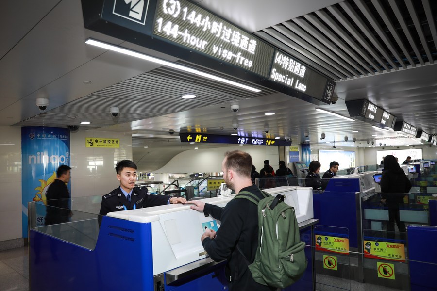 A passenger goes through the procedure of 144-hour visa-free transit at an airport in Qingdao, east China's Shandong Province, Jan. 1, 2019. (Xinhua /Xie Hao)