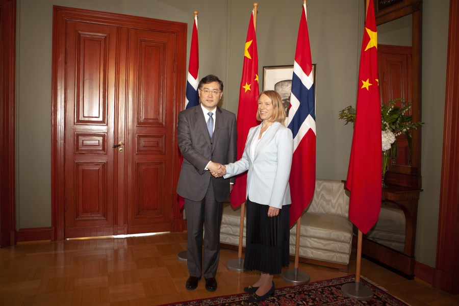 Chinese State Councilor and Foreign Minister Qin Gang (L) shakes hands with Norwegian Foreign Minister Anniken Huitfeldt during their meeting in Oslo, Norway, on May 12, 2023. (Xinhua/Lin Jing)
