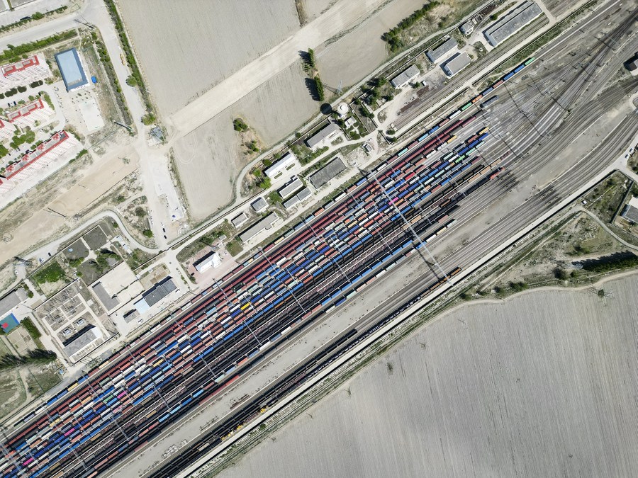 This aerial photo taken on May 11, 2023 shows a hump yard of a railway port in Horgos, northwest China's Xinjiang Uygur Autonomous Region. (Xinhua/Hao Zhao)