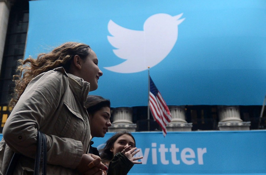 Pedestrians pass by a giant logo of Twitter hanging on the front gate of the New York Stock Exchange (NYSE) in New York, the United States, Nov. 7, 2013. (Xinhua/Wang Lei)