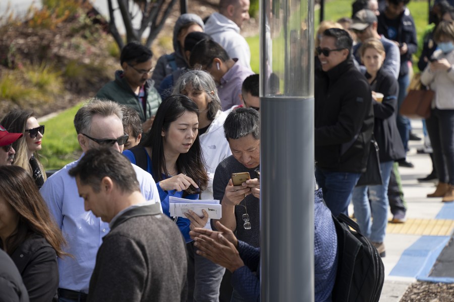 People queue up outside the headquarters of the Silicon Valley Bank (SVB) in Santa Clara, California, the United States, March 13, 2023. (Photo by Li Jianguo/Xinhua)