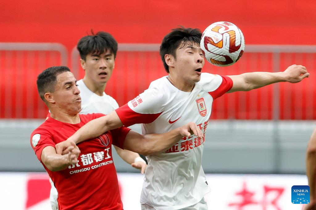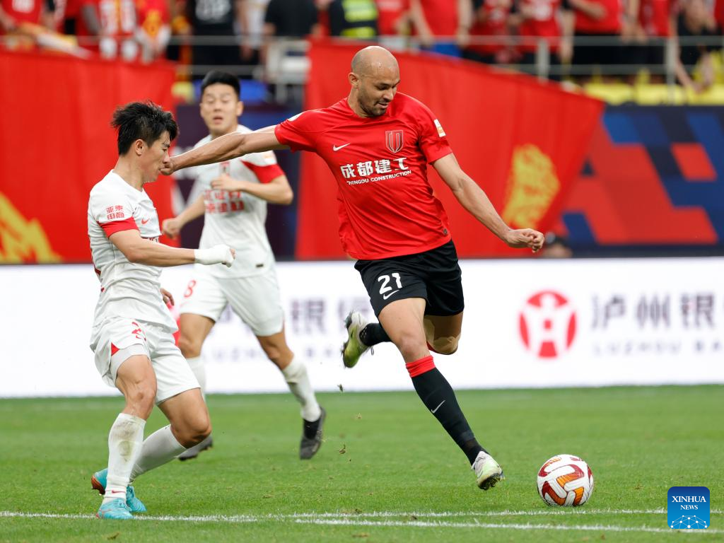 Romulo (1st R) of Chengdu Rongcheng competes during a 2023 season Chinese Football Association Super League (CSL) 7th round match between Chengdu Rongcheng and Changchun Yatai in Chengdu of southwest China's Sichuan Province, on May 14, 2023. (Xinhua/Shen Bohan)