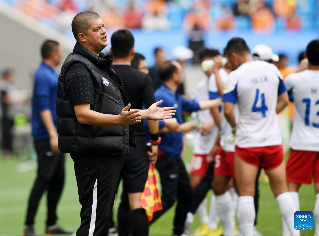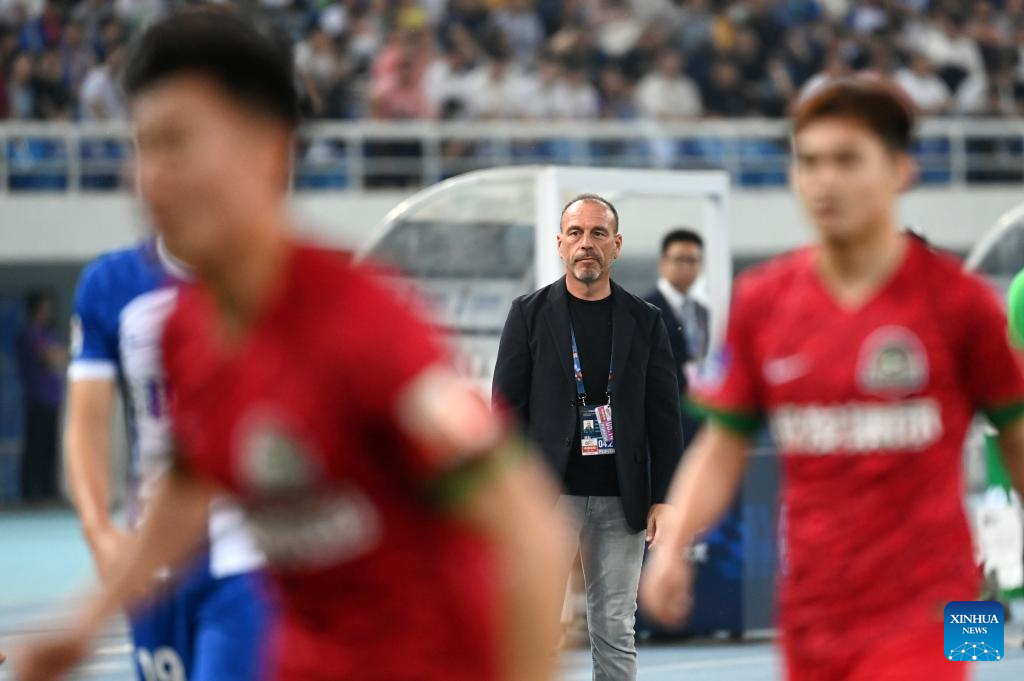 Milan Ristic (L), head coach of Meizhou Hakka, gestures during a 2023 season Chinese Football Association Super League (CSL) 7th round match between Qingdao Hainiu and Meizhou Hakka in Qingdao of east China's Shandong Province, on May 14, 2023. (Xinhua/Li Ziheng)