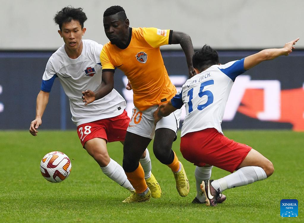 Evans Kangwa (C) of Qingdao Hainiu competes during a 2023 season Chinese Football Association Super League (CSL) 7th round match between Qingdao Hainiu and Meizhou Hakka in Qingdao of east China's Shandong Province, on May 14, 2023. (Xinhua/Li Ziheng)