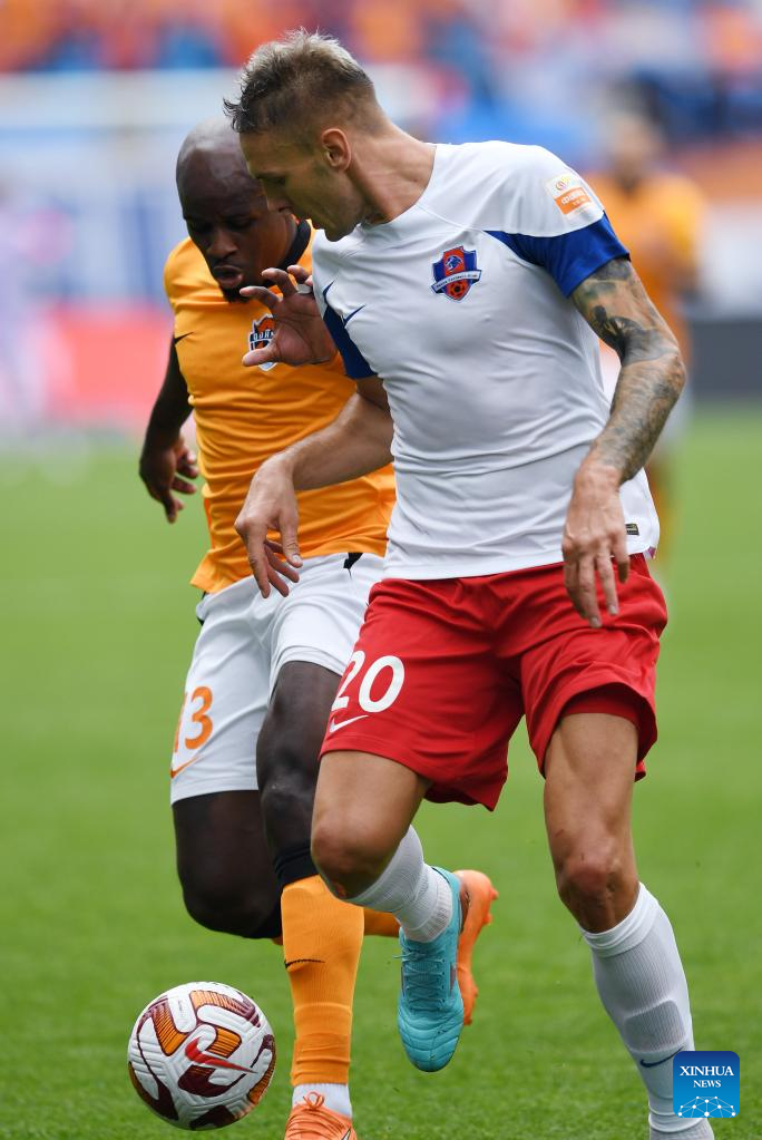 Felipe Silva (R) of Chengdu Rongcheng competes during a 2023 season Chinese Football Association Super League (CSL) 7th round match between Chengdu Rongcheng and Changchun Yatai in Chengdu of southwest China's Sichuan Province, on May 14, 2023. (Xinhua/Shen Bohan)