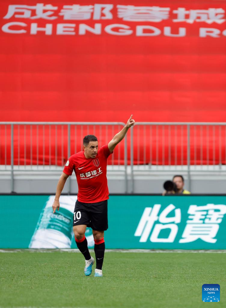 Romulo of Chengdu Rongcheng celebrates scoring during a 2023 season Chinese Football Association Super League (CSL) 7th round match between Chengdu Rongcheng and Changchun Yatai in Chengdu of southwest China's Sichuan Province, on May 14, 2023. (Xinhua/Shen Bohan)