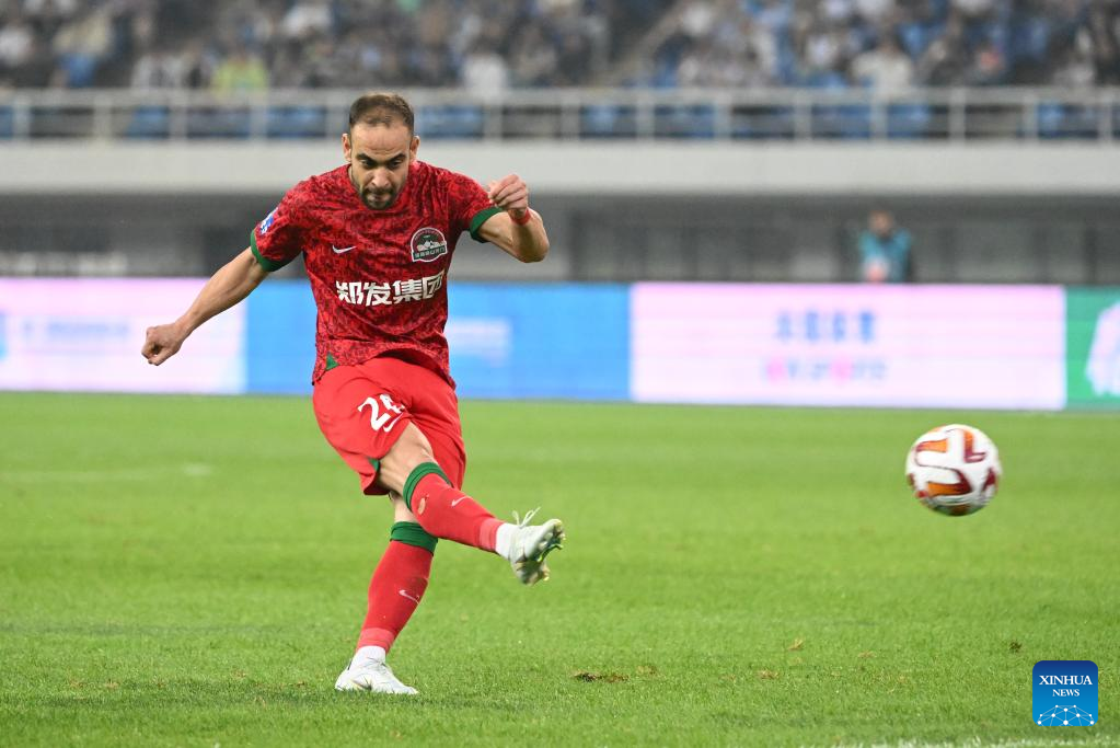 Nemanja Covic of Henan SSLM shoots during a 2023 season Chinese Football Association Super League (CSL) 7th round match between Tianjin Jinmen Tiger and Henan SSLM in north China's Tianjin Municipality, on May 14, 2023. (Xinhua/Sun Fanyue)