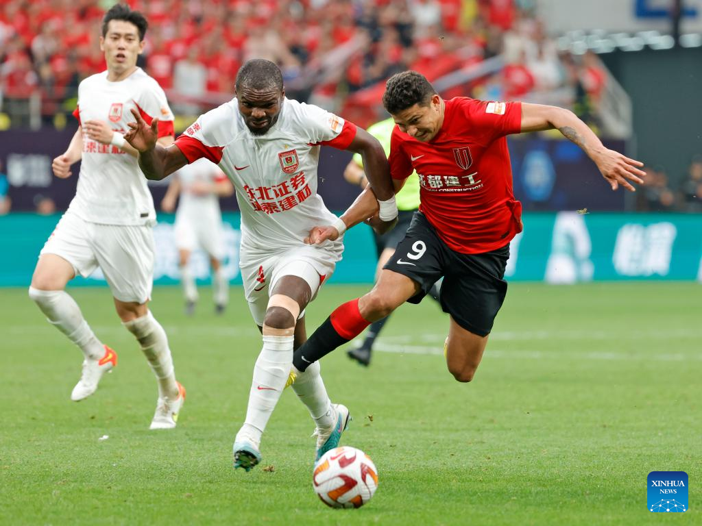 Romulo (L) of Chengdu Rongcheng vies with Jores Okore of Changchun Yatai during a 2023 season Chinese Football Association Super League (CSL) 7th round match between Chengdu Rongcheng and Changchun Yatai in Chengdu of southwest China's Sichuan Province, on May 14, 2023. (Xinhua/Shen Bohan)