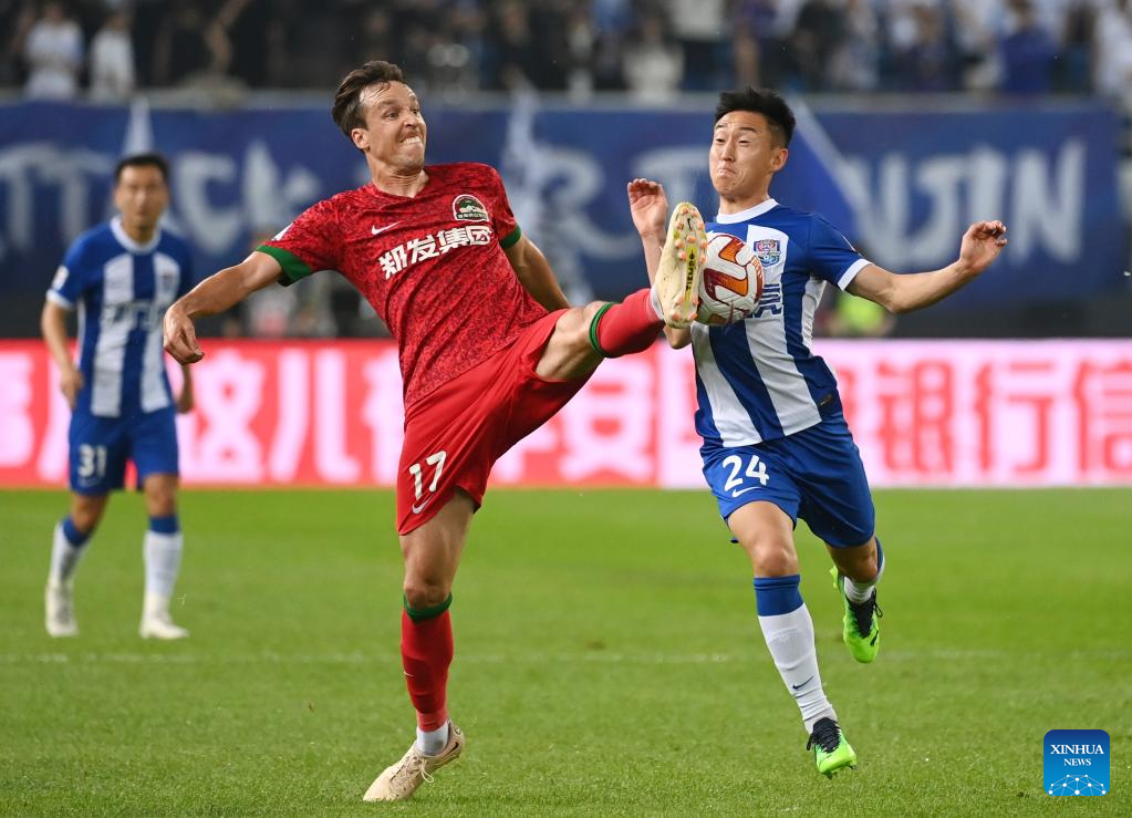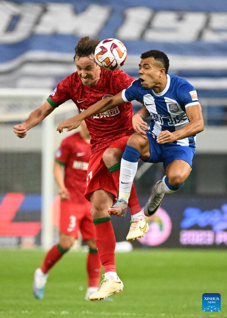 Tomas Pina (L) of Henan SSLM vies with Piao Taoyu of Tianjin Jinmen Tiger during a 2023 season Chinese Football Association Super League (CSL) 7th round match between Tianjin Jinmen Tiger and Henan SSLM in north China's Tianjin Municipality, on May 14, 2023. (Xinhua/Zhao Zishuo)