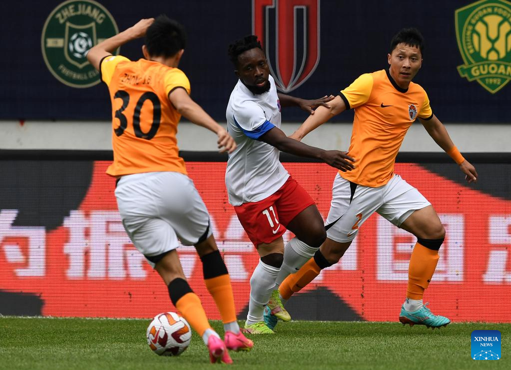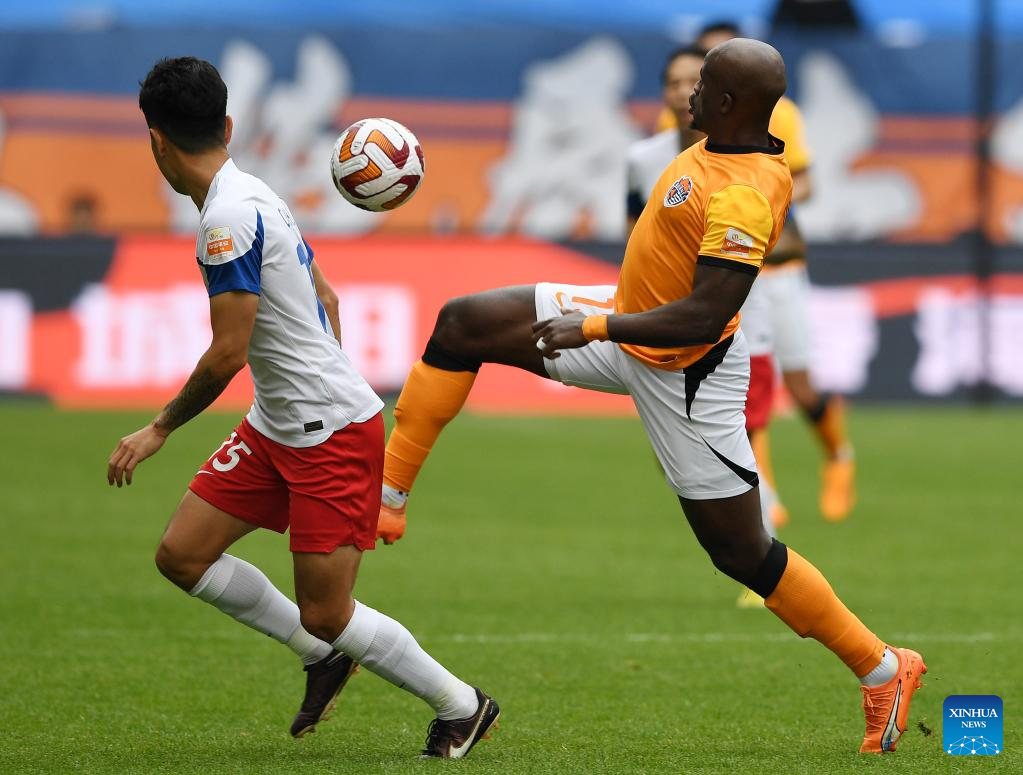Chisom Egbuchulam (C) of Meizhou Hakka competes during a 2023 season Chinese Football Association Super League (CSL) 7th round match between Qingdao Hainiu and Meizhou Hakka in Qingdao of east China's Shandong Province, on May 14, 2023. (Xinhua/Li Ziheng)