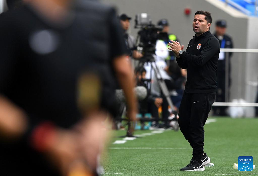 Antonio Gomez, head coach of Qingdao Hainiu, gestures during a 2023 season Chinese Football Association Super League (CSL) 7th round match between Qingdao Hainiu and Meizhou Hakka in Qingdao of east China's Shandong Province, on May 14, 2023. (Xinhua/Li Ziheng)