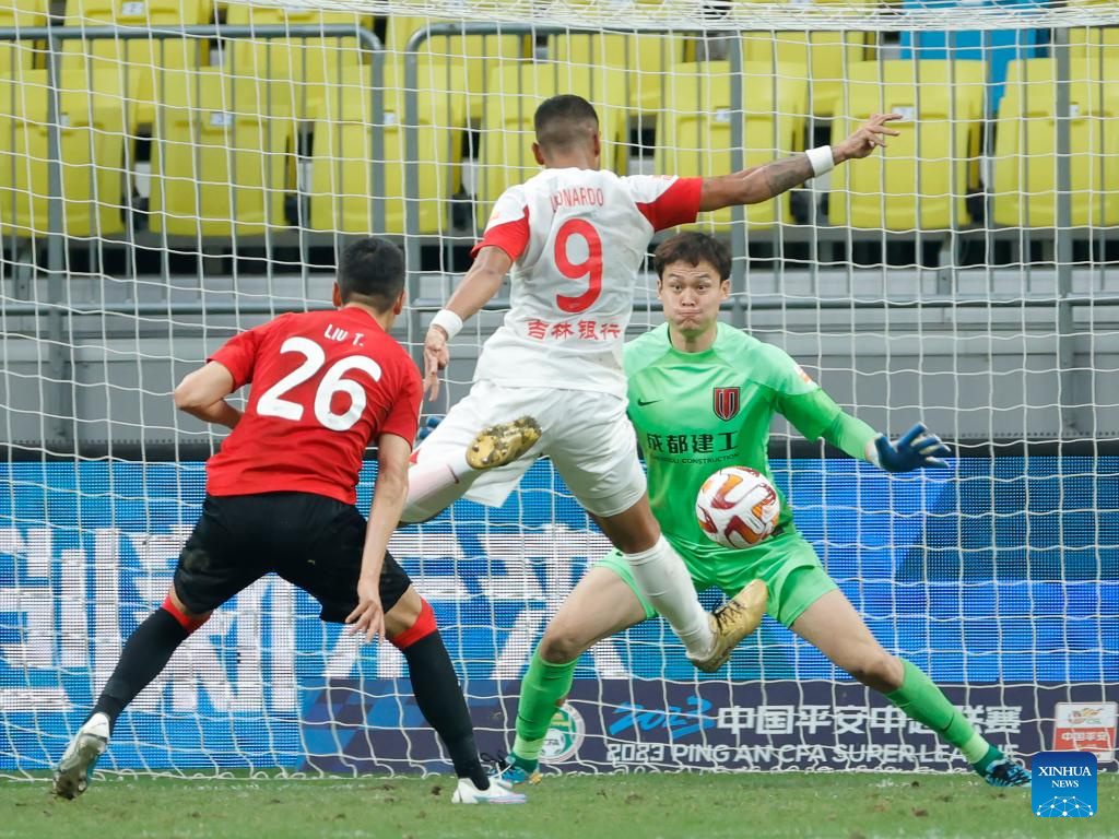 Leonardo (C) of Changchun Yatai scores during a 2023 season Chinese Football Association Super League (CSL) 7th round match between Chengdu Rongcheng and Changchun Yatai in Chengdu of southwest China's Sichuan Province, on May 14, 2023. (Xinhua/Shen Bohan)