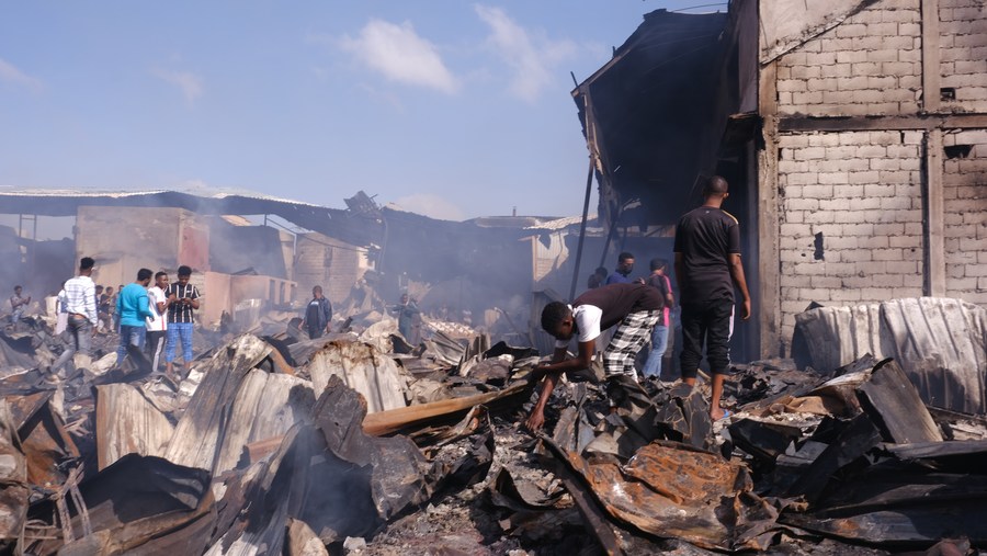 This photo taken on Jan. 22, 2023 shows people searching the destruction caused by a fire that gutted parts of Mogadishu's largest market in Mogadishu, Somalia. According to sources, the cause of the fire remains unclear, but it is believed to be relevant to an electrical fault. (Photo by Hassan Bashi/Xinhua)