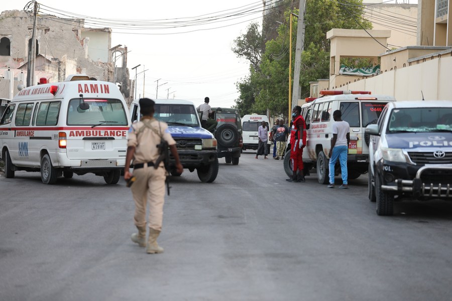 The file photo shows a police officer beefing up security at the scene of militants attack in Mogadishu, capital of Somalia, on Jan. 22, 2023. (Photo by Hassan Bashi/Xinhua)