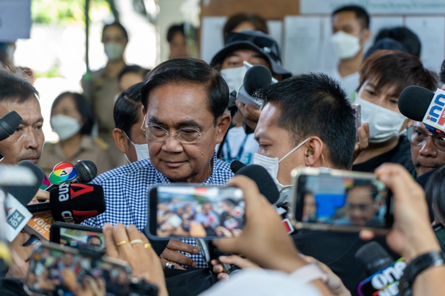 Thai Prime Minister Prayut Chan-o-cha gives an interview at a polling station in Bangkok, Thailand, May 14, 2023. (Xinhua/Lin Hao)