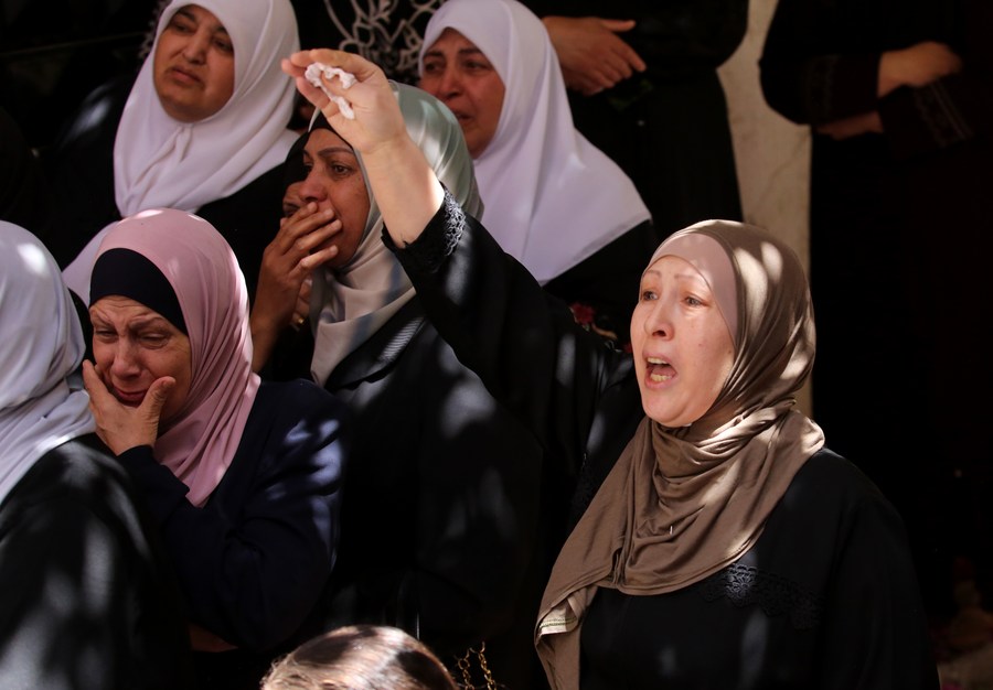 Relatives mourn during the funeral of Salleh Sabra in the Askar refugee camp close to the northern West Bank city of Nablus, May 15, 2023. (Photo by Nidal Eshtayeh/Xinhua) ■