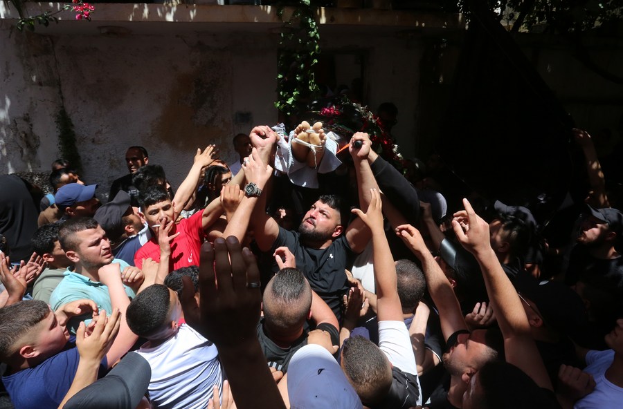 Mourners carry the body of Salleh Sabra during his funeral in the Askar refugee camp close to the northern West Bank city of Nablus, May 15, 2023. (Photo by Nidal Eshtayeh/Xinhua)