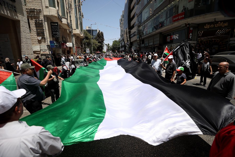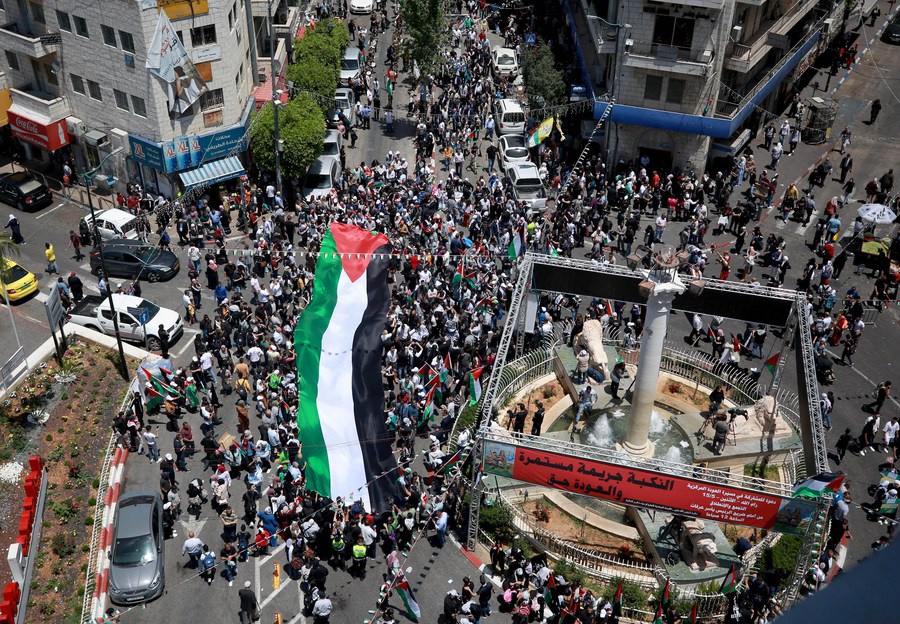 GAZA/RAMALLAH, May 15 (Xinhua) -- Palestinians in the West Bank and the Gaza Strip marked the 75th anniversary of the Palestinian Nakba day, or the day of "catastrophe," on Monday with large-scale rallies and demonstrations.