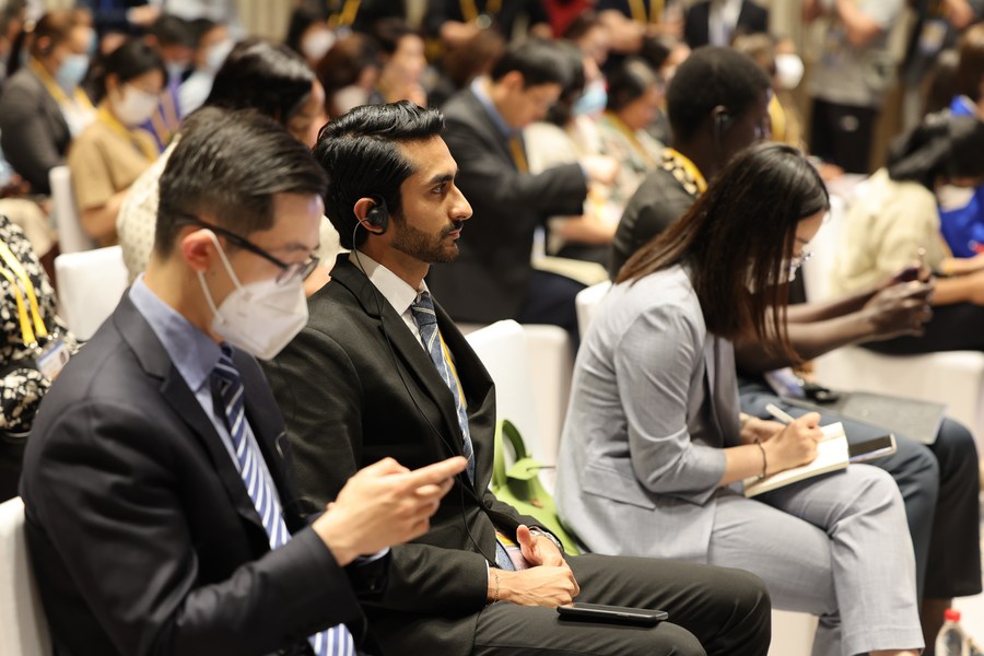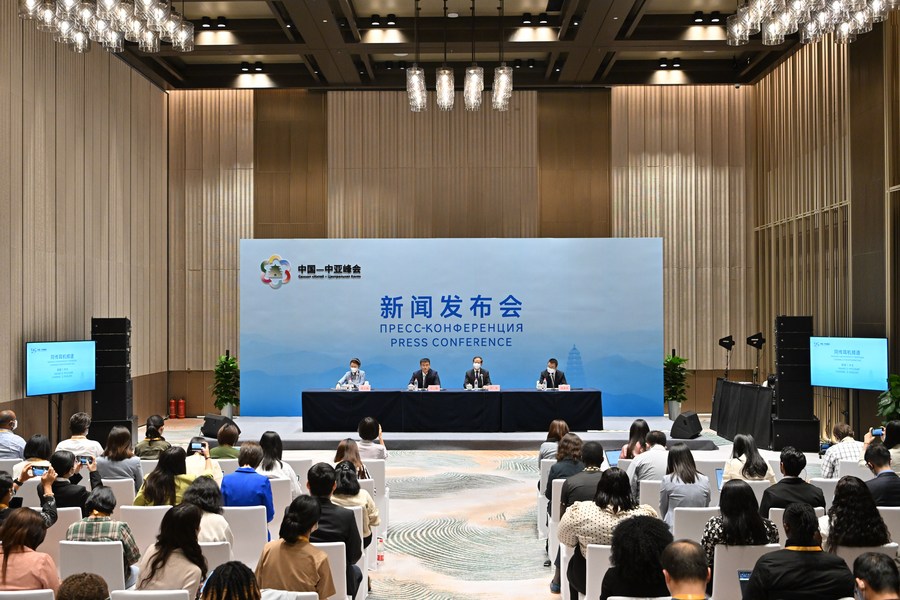 Journalists attend a press briefing on the China-Central Asia Summit in Xi'an, northwest China's Shaanxi Province, May 16, 2023. (Xinhua/Xing Guangli)
