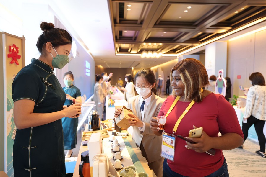 A journalist experiences traditional Chinese culture at the media center of the China-Central Asia Summit in Xi'an, northwest China's Shaanxi Province, May 16, 2023. The media center of the China-Central Asia Summit opened on Tuesday to provide services for journalists. (Xinhua/Xing Guangli)