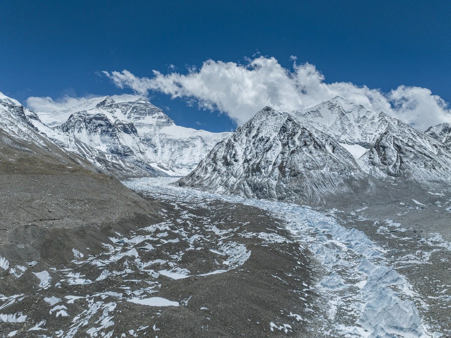 This aerial photo taken on May 15, 2023 shows Central Rongbuk glacier at the foot of Mount Qomolangma, southwest China's Tibet Autonomous Region. With the east, central, and west branches, Rongbuk glacier is the biggest and most famous compound valley glacier at the foot of Mount Qomolangma. (Xinhua/Sun Fei)