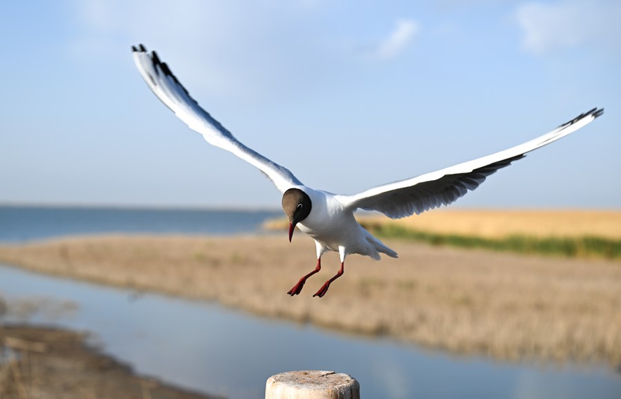 A relict gull flies over the Juyan Lake in Ejina Banner of Alxa League, north China's Inner Mongolia Autonomous Region, May 17, 2023. (Xinhua/Bei He)