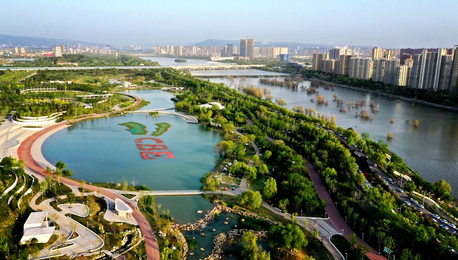 This aerial photo taken on April 16, 2023 shows the scenery along the Bahe River at the Chanba ecological zone in Xi'an, northwest China's Shaanxi Province. Areas surrounding the Bahe River in historic city of Xi'an is picturesque and full of ecological vitality. (Xinhua/Liu Xiao)