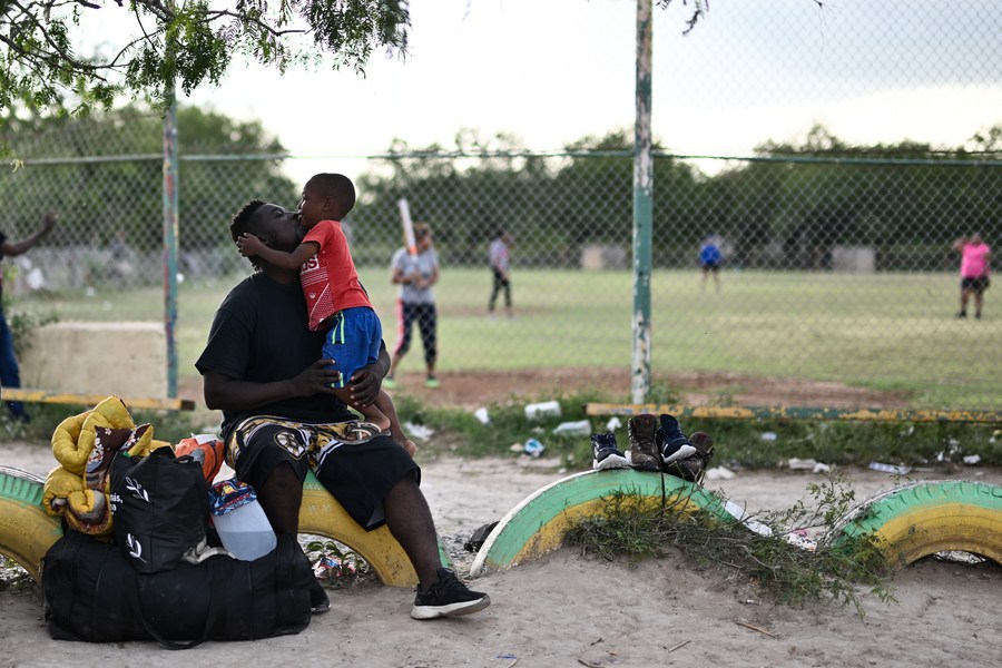 A man kisses his child outside a migrant camp in Reynosa, Mexico, May 16, 2023. U.S. and Mexican authorities expect a surge in migrants headed towards the United States with the end of Title 42, a COVID-related restriction used as a tool to turn back migrants at the U.S.-Mexico border. (Xinhua/Xin Yuewei)