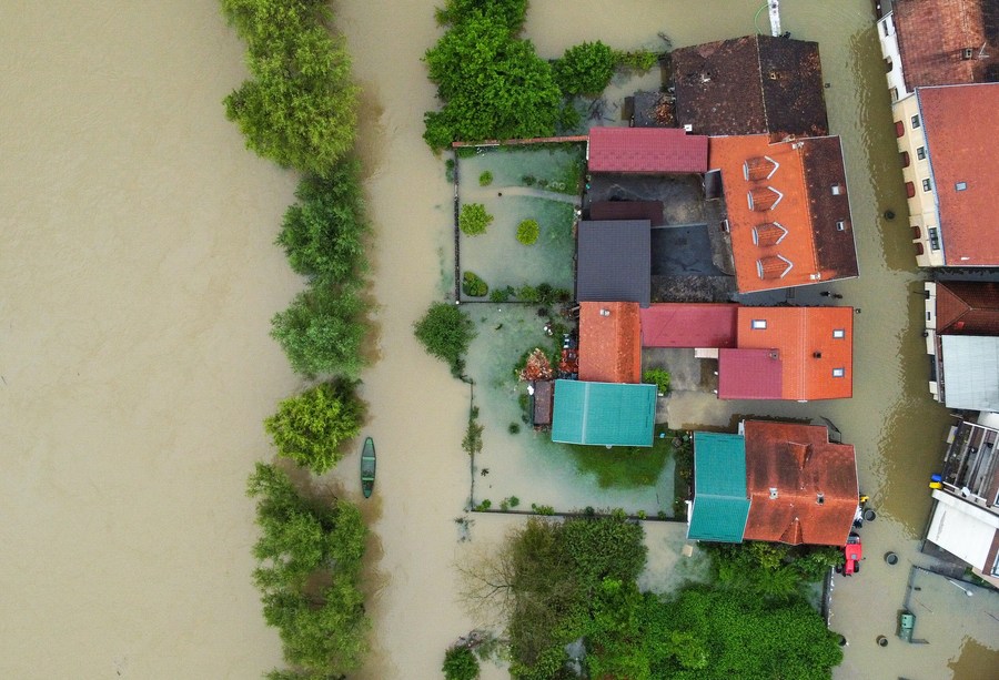 This aerial photo taken on May 17, 2023 shows flooded houses near the Una River in Kostajnica, Croatia. Heavy rainfall from last Friday has caused widespread floods in Croatia, triggering the declaration of a state of emergency in the country's central and southeastern areas of Karlovac and Kostajnica. Meanwhile, heavy rainfall has also triggered flood warnings or caused flooding and damages across Central Europe. (Igor Soban/PIXSELL via Xinhua)■