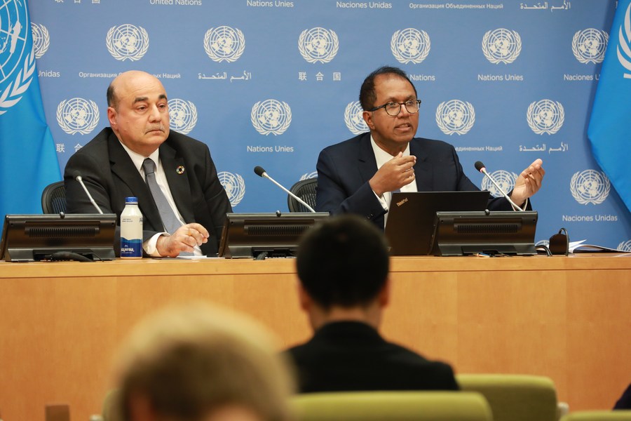 Hamid Rashid (R), lead author of the mid-year update of the January 2023 World Economic Situation and Prospects report, speaks at the report release briefing at the UN headquarters in New York, May 16, 2023. (Xinhua/Xie E)