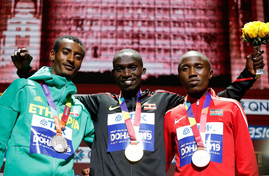 Silver medalist, Yomif Kejelcha of Ethiopia, gold medalist, Joshua Cheptegei of Uganda, and bronze medalist, Rhonex Kipruto of Kenya (from L to ), pose for photos during the awarding ceremony of men's 10,000m at the 2019 IAAF World Athletics Championships in Doha, Qatar, Oct. 6, 2019. (Xinhua/Wang Lili)