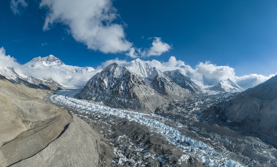 This aerial panorama photo taken on May 16, 2023 shows Central Rongbuk glacier (L) and West Rongbuk glacier (R) at the foot of Mount Qomolangma, southwest China's Tibet Autonomous Region. (Xinhua/Sun Fei)