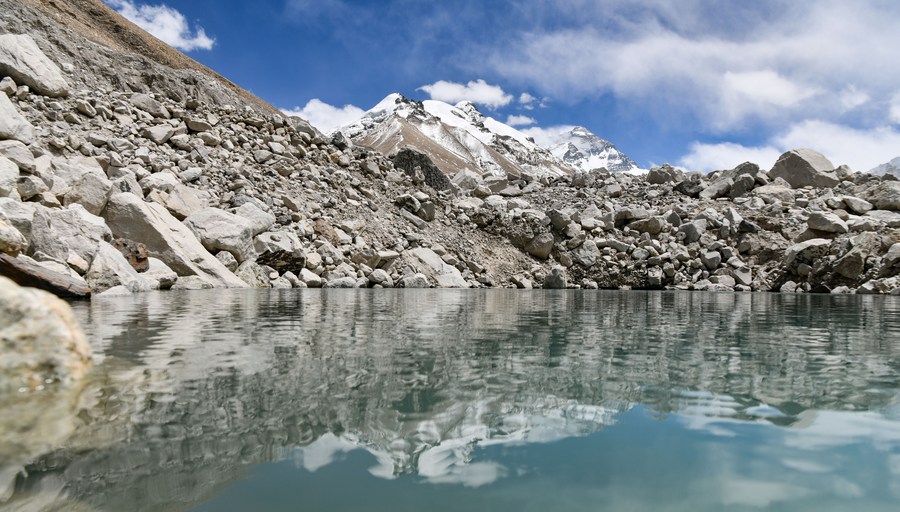 This photo taken on May 12, 2023 shows a lake formed by water melted from Rongbuk glacier, in southwest China's Tibet Autonomous Region. (Xinhua/Jigme Dorje)