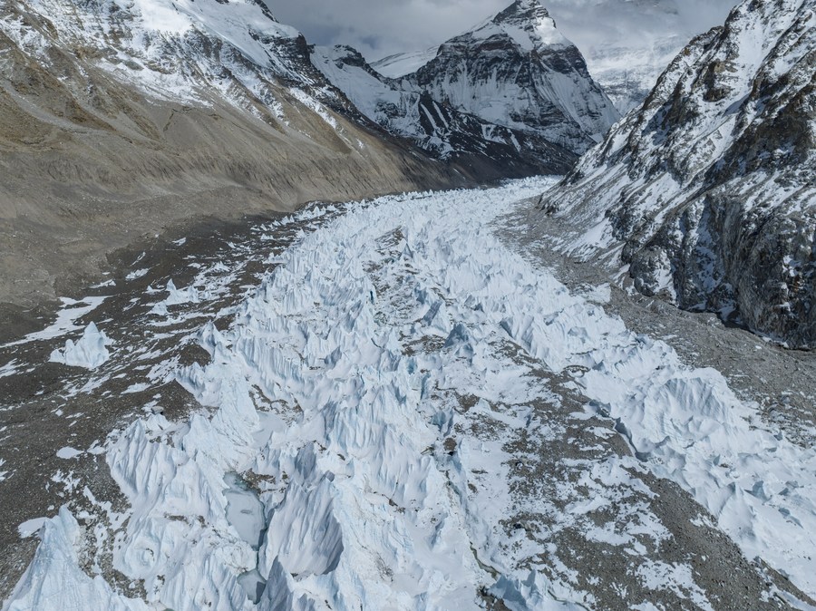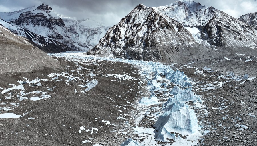 This aerial photo taken on May 15, 2023 shows Central Rongbuk glacier (front) and West Rongbuk glacier (rear) at the foot of Mount Qomolangma, southwest China's Tibet Autonomous Region. (Xinhua/Sun Fei)