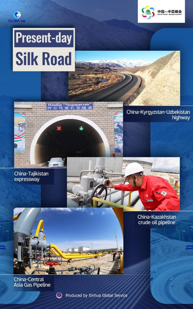 The China-Kyrgyzstan-Uzbekistan highway that runs across the Tianshan Mountain, the China-Tajikistan expressway that defies the Pamir Plateau, and the China-Kazakhstan crude oil pipeline and the China-Central Asia Gas Pipeline that traverse the vast desert -- they are the present-day Silk Road.