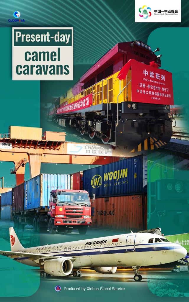 The China-Europe Railway Express operating around the clock, the endless streams of freight trucks, and crisscrossing flights -- they are the present-day camel caravans.